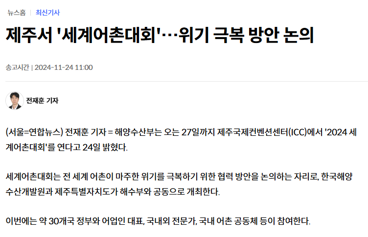 목록 [연합뉴스] 제주서 '세계어촌대회'…위기 극복 방안 논의 페이지 정보 작성자 최고관리자 이메일 admin@domain.com 작성일 24-11-26 본문 . 관련링크 https://www.yna.co.kr/view/AKR20241122133700030?input=1195m 209회 연결 이전글 [데일리안] 해수부, 2024 세계어촌대회 개최…‘대전환 시대 어촌 도전과제’ 논의 24.11.26 목록 다음글 [뉴시스] 해수부, 제주서 ‘2024 세계어촌대회’…30개국 정부·어업인 대표 참가 24.11.26