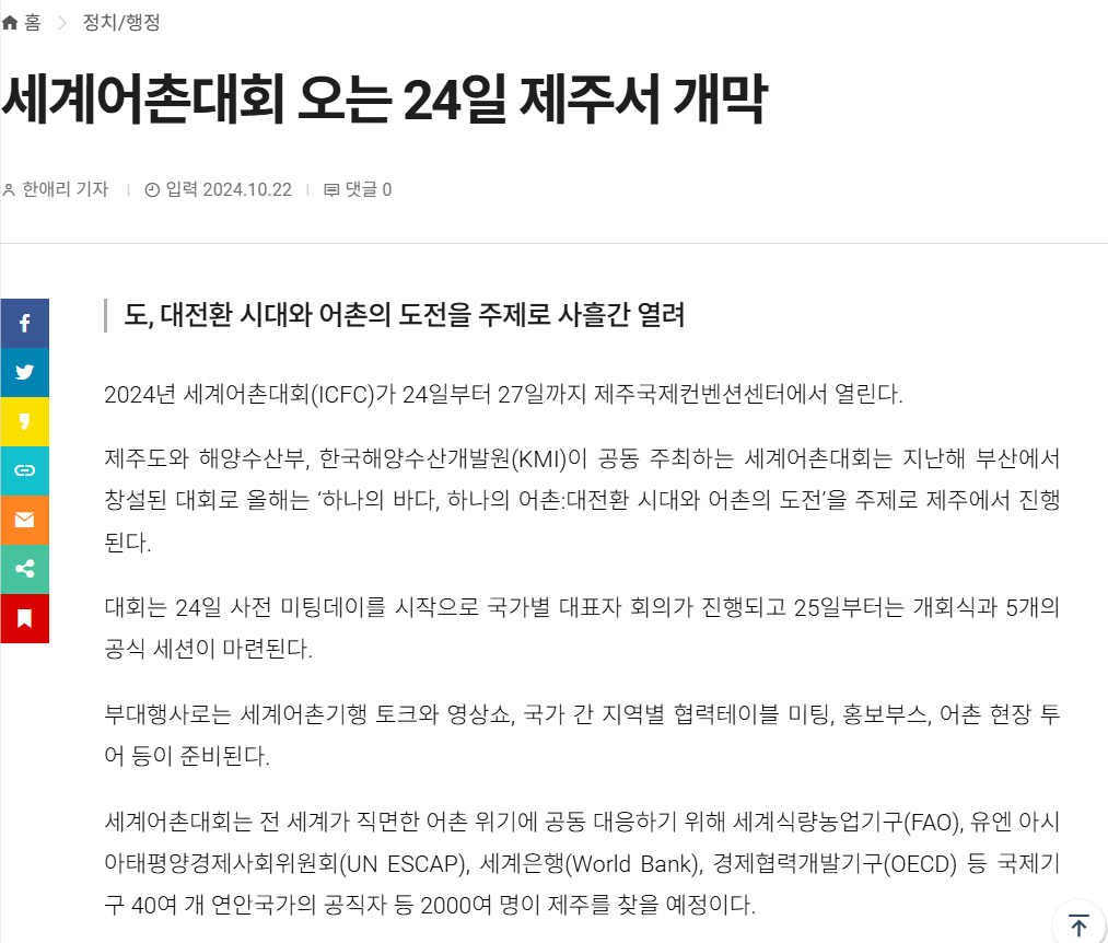 목록 [제주매일] 세계어촌대회 오는 24일 제주서 개막 페이지 정보 작성자 최고관리자 이메일 admin@domain.com 작성일 24-11-26 본문 . 관련링크 https://www.jejumaeil.net/news/articleView.html?idxno=341449 262회 연결 이전글 [제민일보] '2024 세계어촌대회' 내달 제주서 개최 24.11.26 목록 다음글 [제주도민일보] 세계어촌대회 내달 24~27일 제주 개최 24.11.26