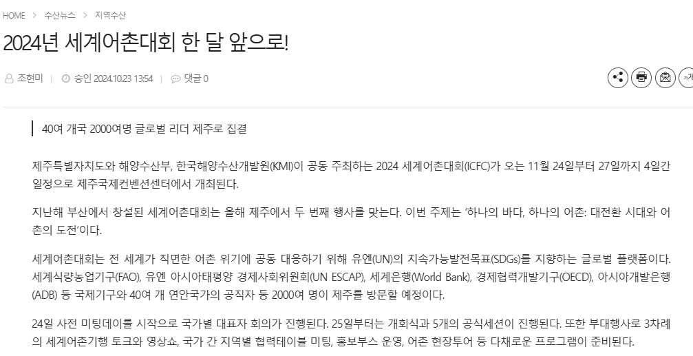 목록 [어업IN수산] 2024년 세계어촌대회 한 달 앞으로! 페이지 정보 작성자 최고관리자 이메일 admin@domain.com 작성일 24-11-26 본문 . 관련링크 http://www.suhyupnews.co.kr/news/articleView.html?idxno=32750 344회 연결 이전글 [뉴스1] 지속 가능한 어촌 발전 논의…'세계어촌대회' 24~27일 제주서 개최 24.11.26 목록 다음글 [제민일보] '2024 세계어촌대회' 내달 제주서 개최 24.11.26