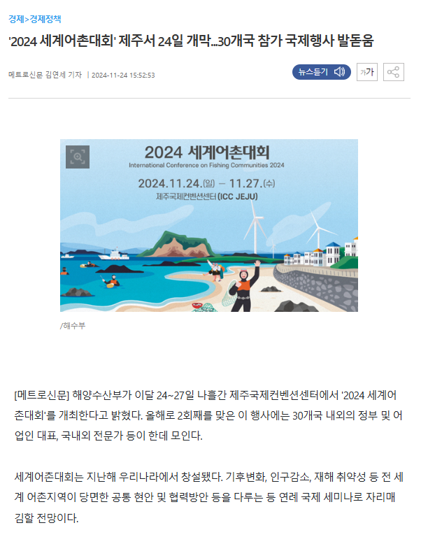 [메트로신문] 2024 세계어촌대회' 제주서 24일 개막...30개국 참가 국제행사 발돋움