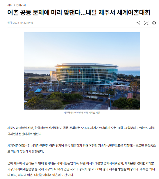 목록 [국민일보] 어촌 공동 문제에 머리 맞댄다…내달 제주서 세계어촌대회 페이지 정보 작성자 최고관리자 이메일 admin@domain.com 작성일 24-11-26 본문 . 관련링크 https://www.kmib.co.kr/article/view.asp?arcid=0020645352&code=61121111… 252회 연결 이전글 [헤드라인제주] '대전환 시대와 어촌의 도전' 2024 세계어촌대회 제주서 개최 24.11.26 목록 다음글 [뉴스1] 세계어촌대회 11월24~27일 제주…40여개국 관계자 2000명 참석 24.11.26