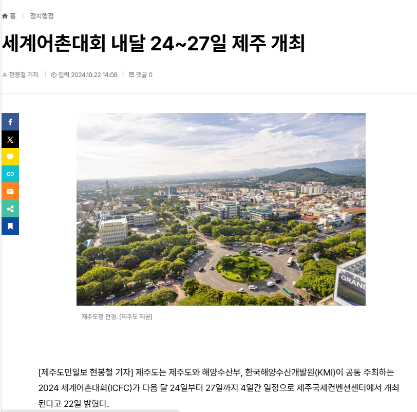 목록 [제주도민일보] 세계어촌대회 내달 24~27일 제주 개최 페이지 정보 작성자 최고관리자 이메일 admin@domain.com 작성일 24-11-26 본문 . 관련링크 https://www.jejudomin.co.kr/news/articleView.html?idxno=305594 252회 연결 이전글 [제주매일] 세계어촌대회 오는 24일 제주서 개막 24.11.26 목록 다음글 [삼다일보] 2024 세계어촌대회 11월 24~27일 ICC제주 24.11.26