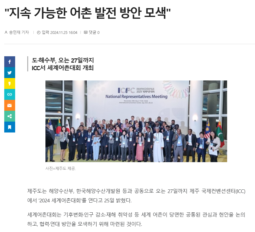 목록 [제민일보] "지속 가능한 어촌 발전 방안 모색" 페이지 정보 작성자 최고관리자 이메일 admin@domain.com 작성일 24-11-26 본문 . 관련링크 https://www.jemin.com/news/articleView.html?idxno=781346 292회 연결 이전글 [CNB뉴스] 제주도, 세계어촌대회 개최…지속 가능한 어촌 발전 논의 24.11.26 목록 다음글 [제주도민일보] 세계어촌대회 제주 개최…30개국 관계자 참여 24.11.26